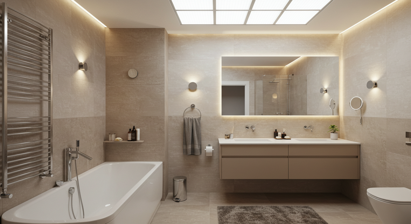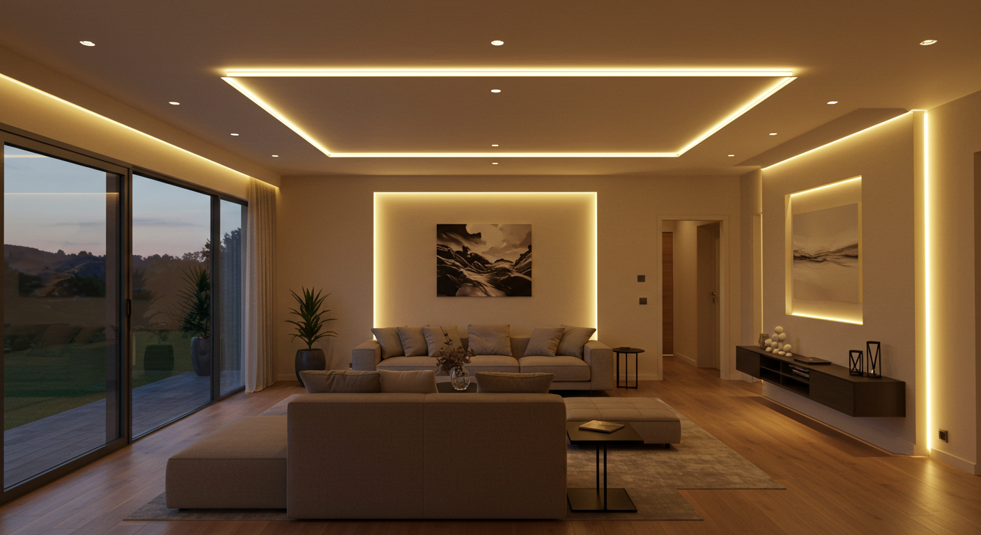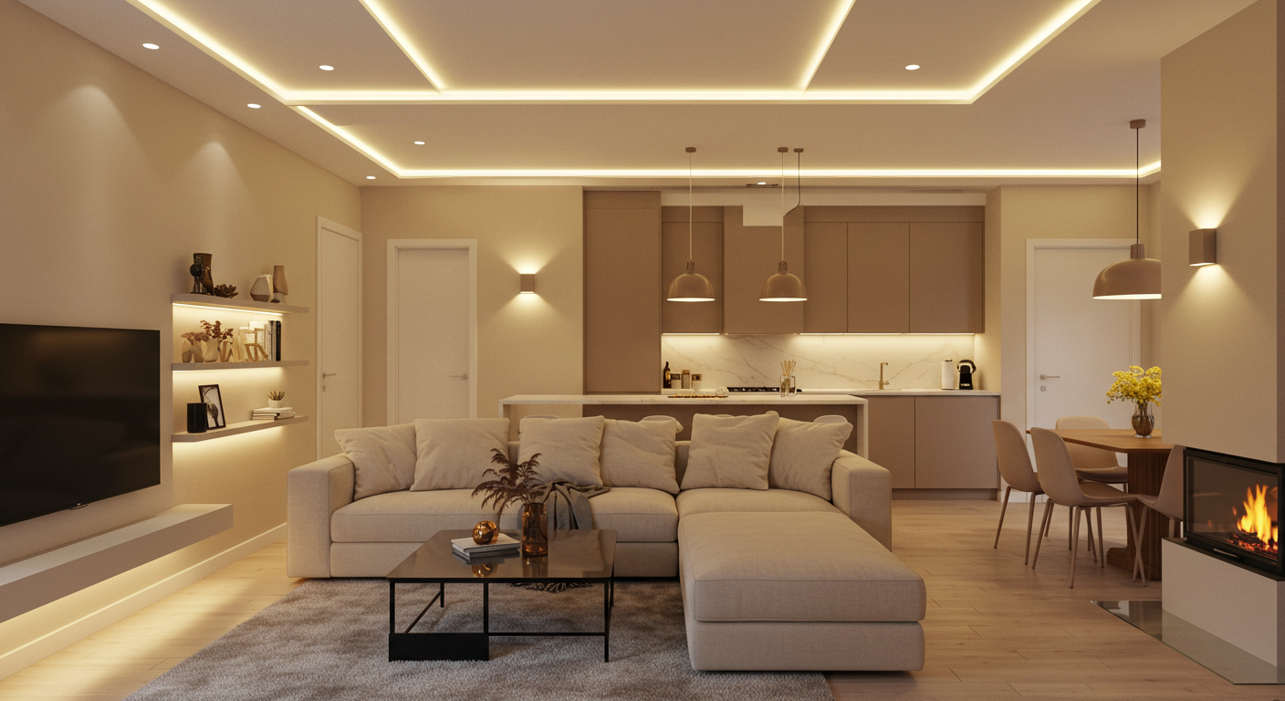 Im Wohnzimmer installierten wir eine Kombination aus dimmbaren Deckenleuchten und indirekter Wandbeleuchtung, um eine gemütliche Atmosphäre zu schaffen. Die warmweißen LEDs sorgen für eine sanfte Ausleuchtung, während zusätzliche Akzentleuchten Kunstwerke und Dekorationen gezielt in Szene setzen.