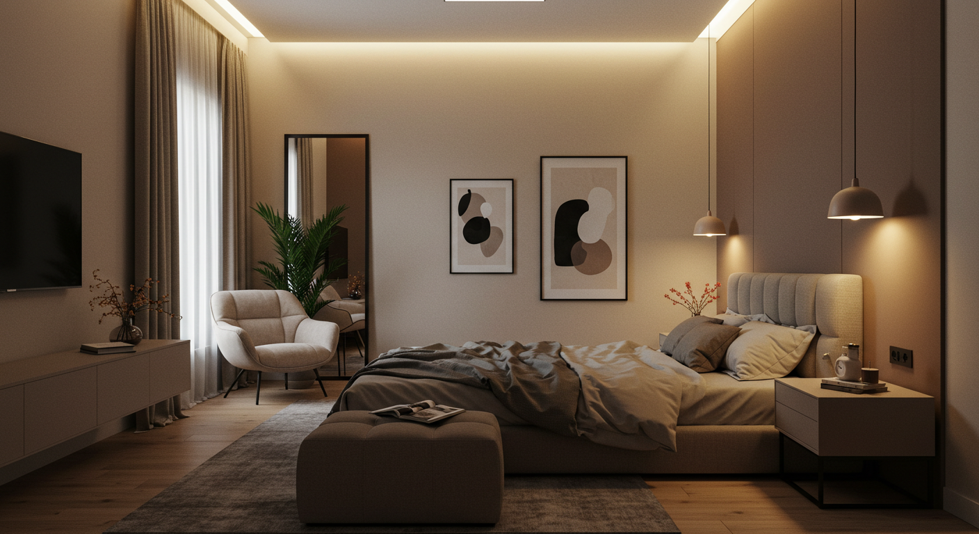Die Schlafzimmer wurden mit warmen Deckenleuchten und dimmbaren Nachttischlampen ausgestattet. Das Lichtkonzept bietet sowohl eine stimmungsvolle Beleuchtung zum Entspannen als auch ausreichend Helligkeit zum Lesen und Ankleiden.