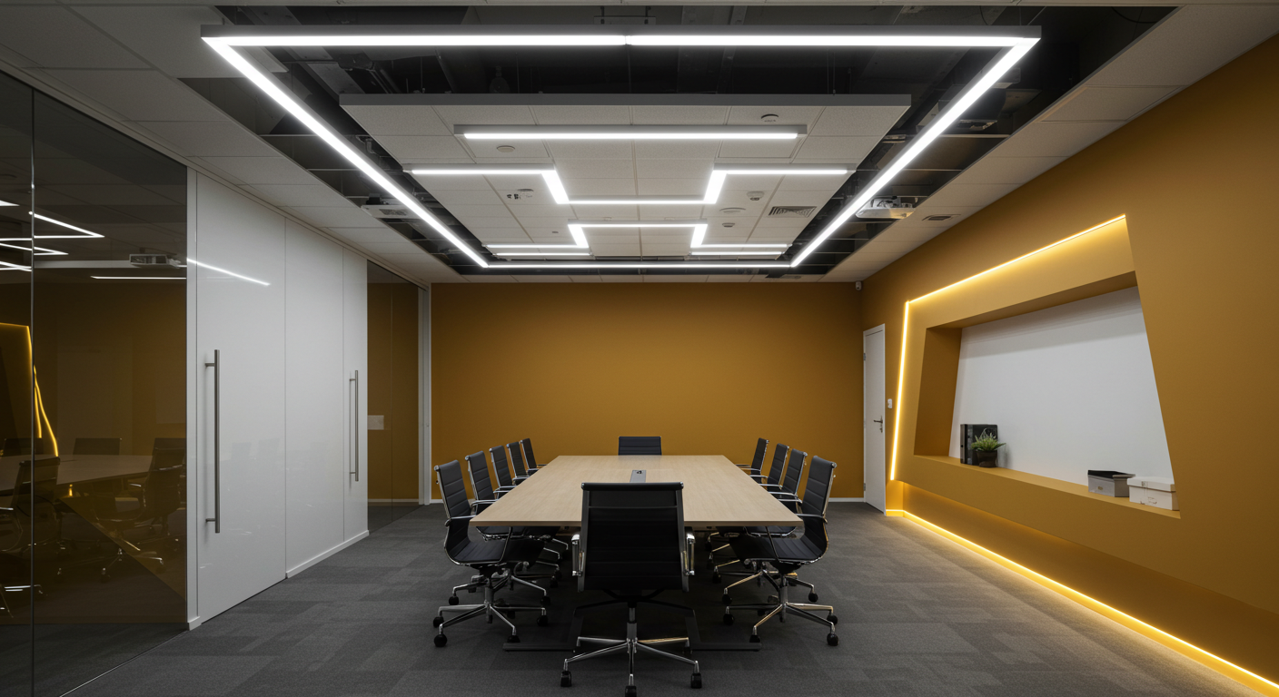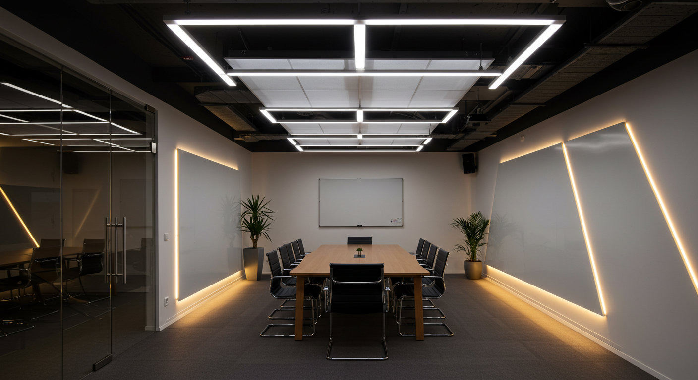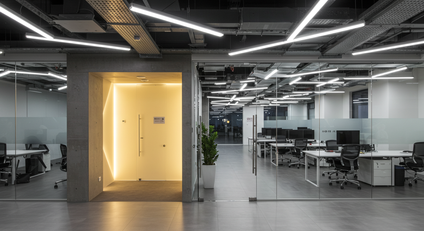 In den Arbeitsbereichen sorgen dimmbare LED-Panels für eine gleichmäßige Ausleuchtung ohne störende Schattenbildung. Tageslichtsensoren passen die Helligkeit automatisch an, um den Energieverbrauch zu minimieren und die Konzentration der Mitarbeiter zu fördern.